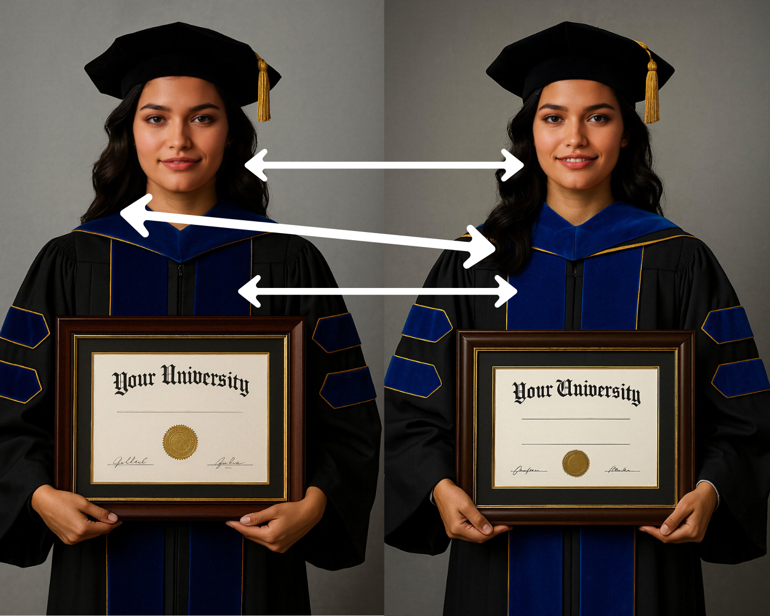Garment/prop mapping changes (e.g., doctoral yoke/collar shape different from last photo).